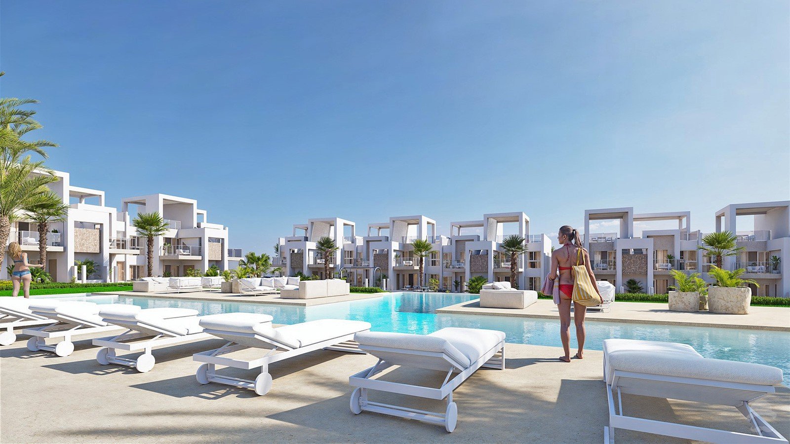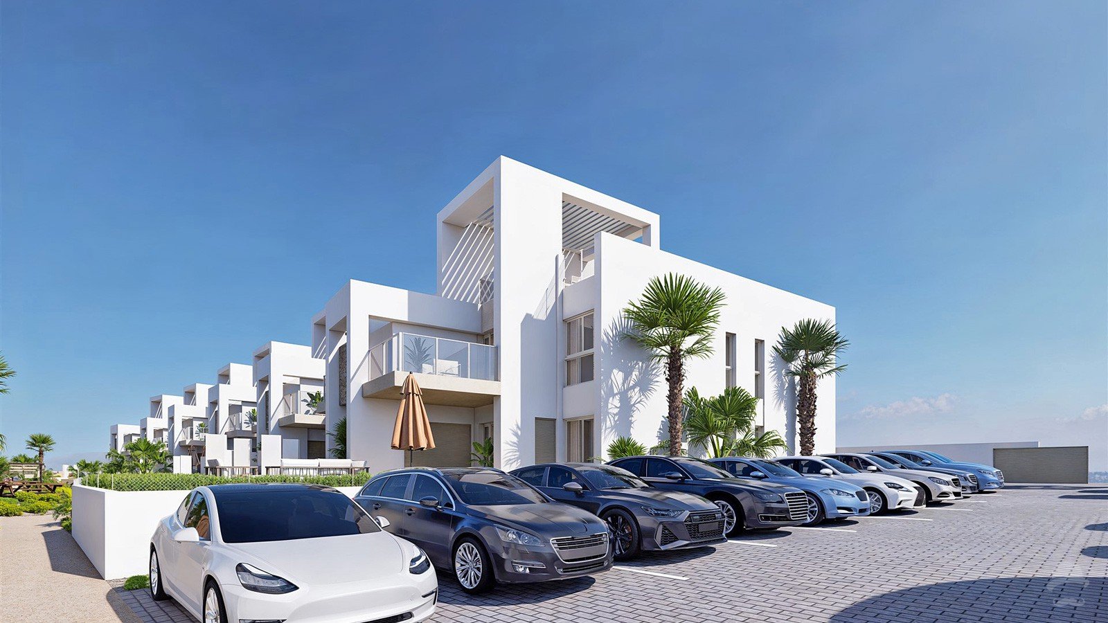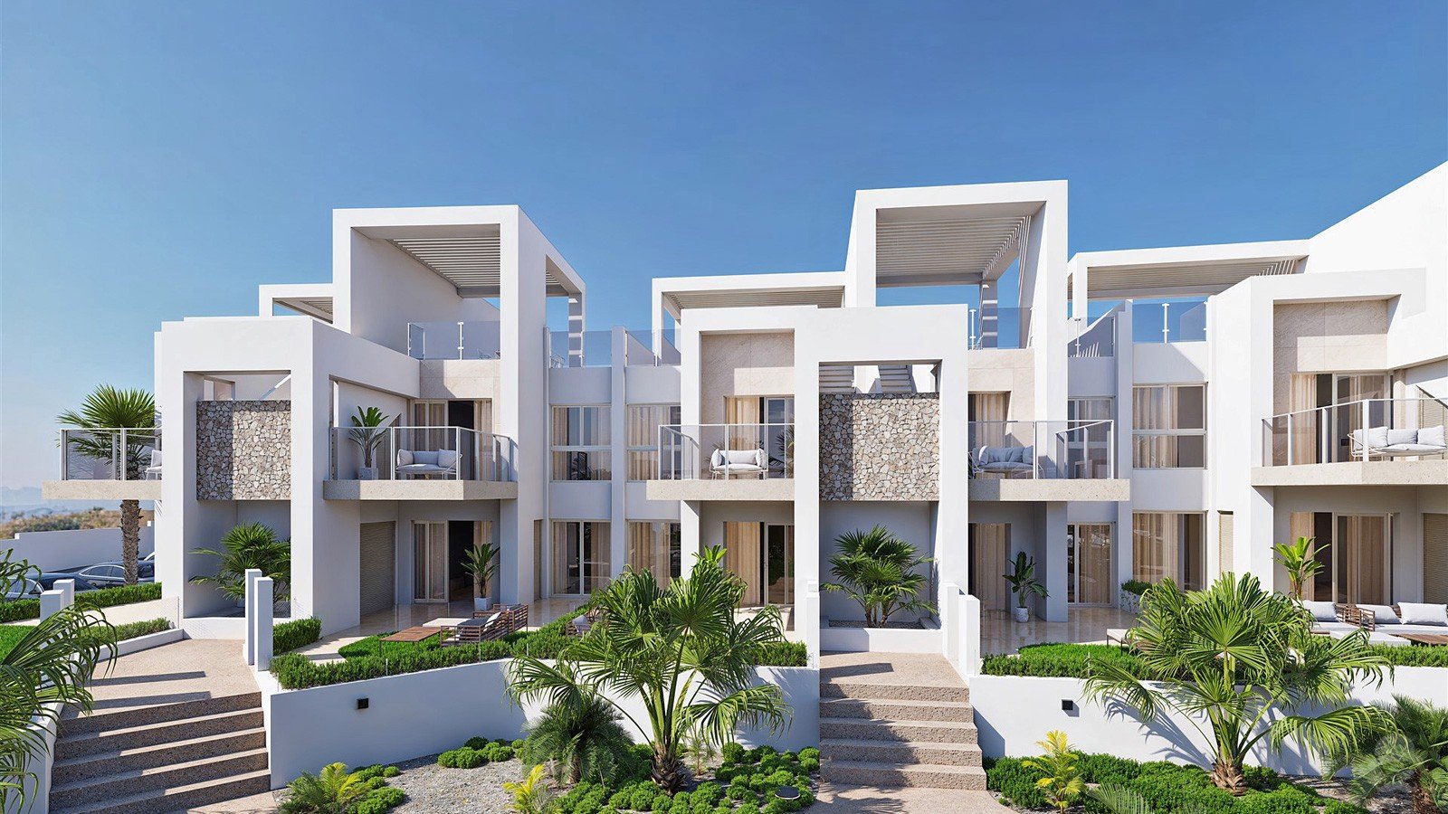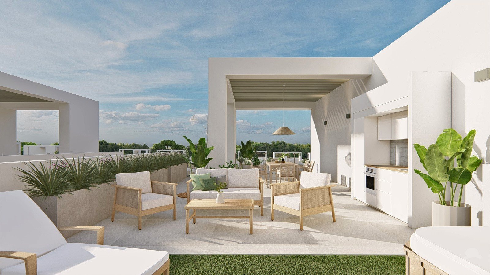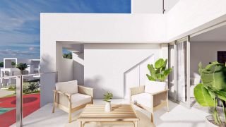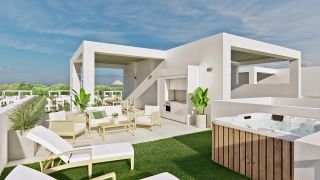 Chic penthouse consisting of 2 bedrooms and 2 bathrooms with an open plan living room and kitchen area offering direct access to the terrace and ample roof terrace from where to enjoy amazing views over the countryside and lagoon. Finished in the most delicate and functional design, perfectly combining indoors with the outdoors, this penthouse offers a modern and fresh setting to spend your Mediterranean days.