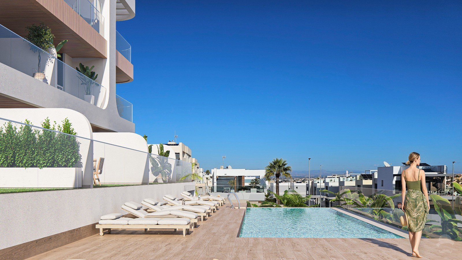 Elegant 3 bed, 2 bathroom penthouse featuring a bright open-plan living area filled with natural light, along with fitted kitchen and bathrooms designed for comfort and functionality. The property boasts an impressive spacious private roof terrace, complete with pre-installation for an outdoor kitchen, creating the perfect setting for alfresco dining whilst enjoying stunning views over the valley and the Mediterranean climate year-round. Finished to high standards, the home includes private parking, storage, and pre-installation for air conditioning.