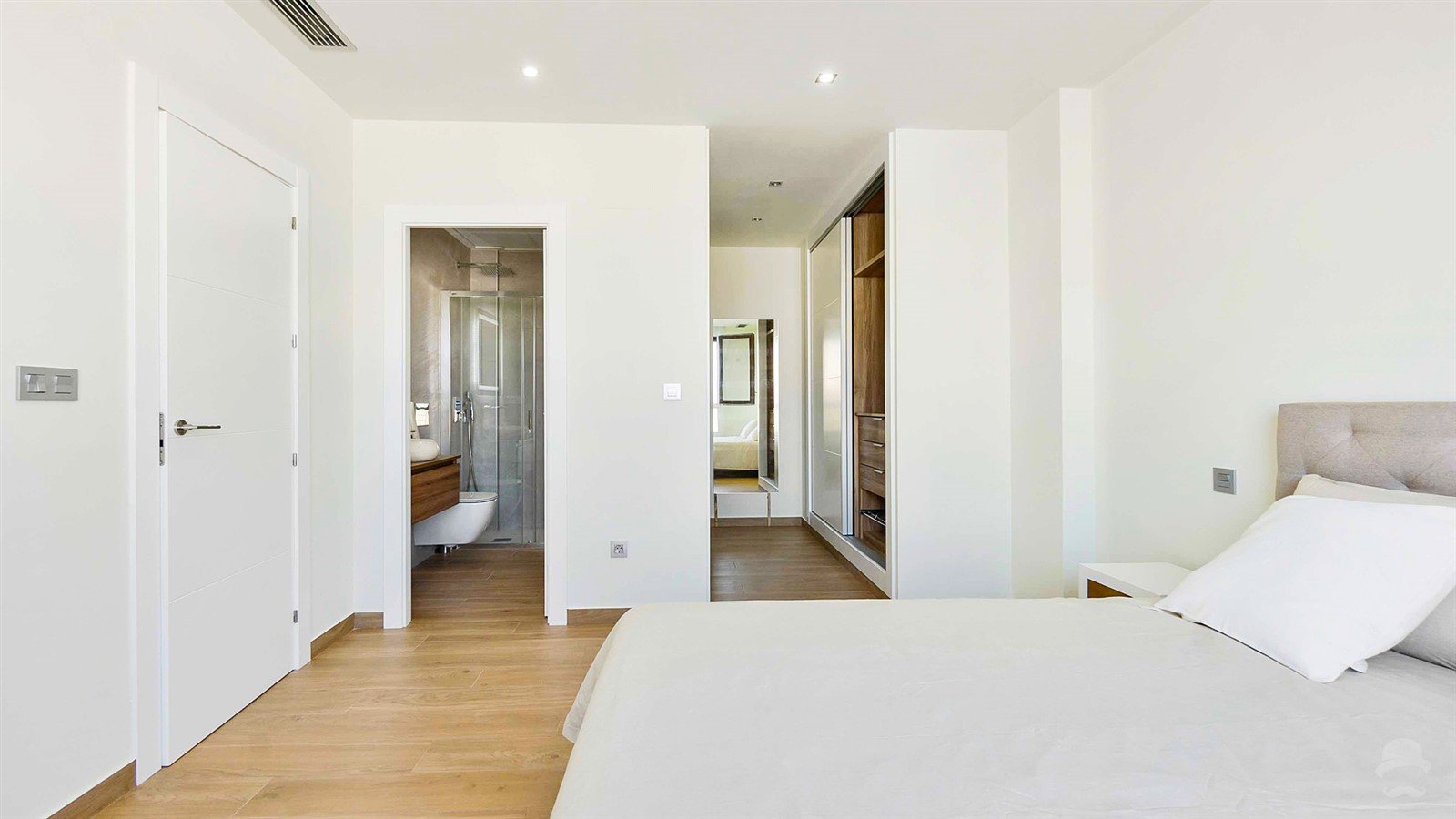 One Off – Modern style villa with spacious terraces and private pool. Set on an elevated corner plot graced by stunning panoramic views over the valley. Designed for ultimate comfort, this two-floor villa with double-height ceiling is crafted with high-quality materials, featuring 3 bedrooms with walk-in closet and ensuite bathrooms and a bright open-plan living area with fully equipped kitchen. From there you have access to the spacious exterior terraces to entertain your guests or for ultimate relaxation in the private pool whilst taking in the views.